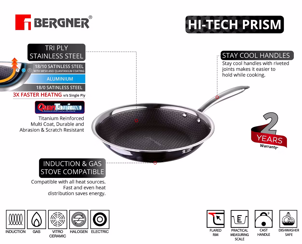 Bergner Hitech Prism Triply Stainless Steel Non Stick Induction Base Frypan, 20 cm (BG-31155)