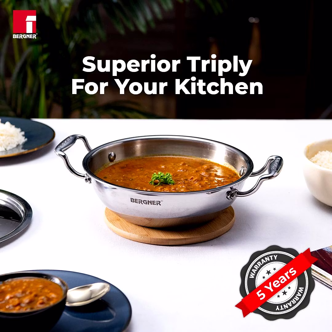 Less Oil Use & Low Flame Cooking : The triply material heats evenly and reduces hot spots, preventing food from burning or sticking. This allows you to use less oil while still achieving a non-stick effect for healthier cooking
