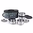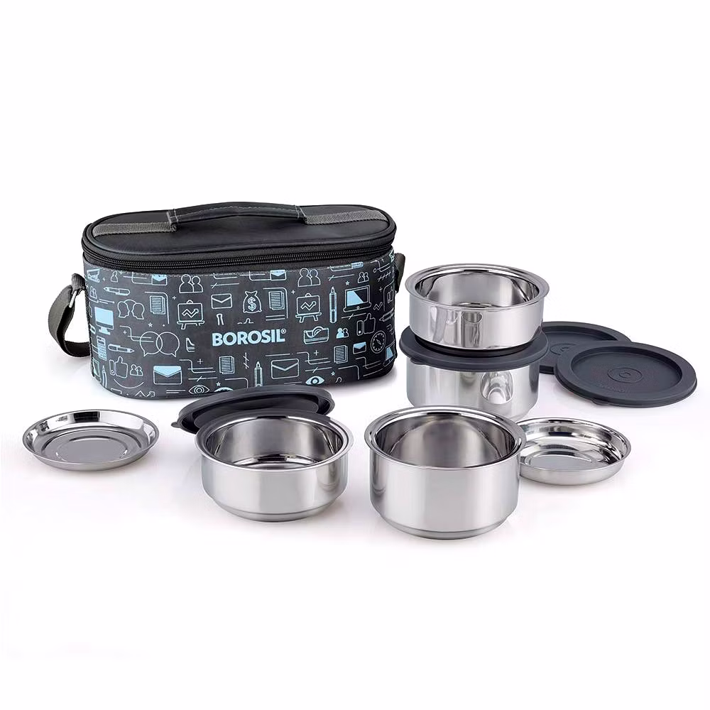 - Material type: Stainless Steel; No. of containers: 4; Capacity of containers: 2 Containers: 280ml Each + 2 Containers: 180ml Each; Contents include: 2 Containers (280ml Each) + 2 Containers (180ml Each) + Lunch Bag; Colour: Bag Colour: Grey | Container Colour: Silver