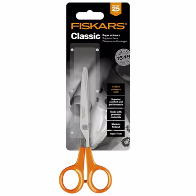Experience legendary cutting performance with the Fiskars Classic Scissors. Crafted in Finland with precision-ground stainless steel blades and iconic orange handles, these 8-inch scissors are perfect for cutting paper, fabric, and more. Durable, sharp, and ergonomically designed, they?re ideal for everyday use at home, school, or in the office.