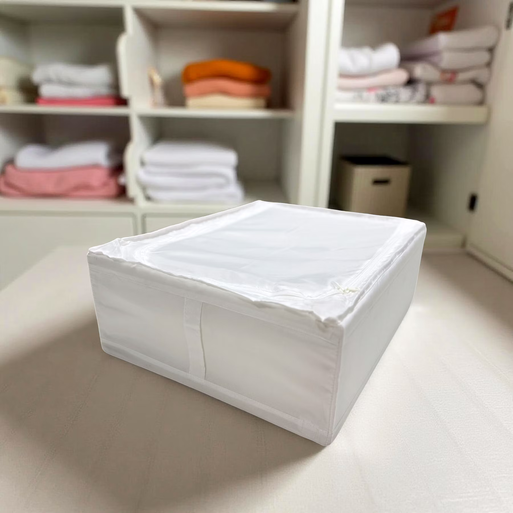 Keep your belongings dust-free and neatly stored with this elegant white foldable storage box. Featuring a secure lid and durable fabric design, it's perfect for organizing clothes, accessories, and household essentials in closets or on shelves.