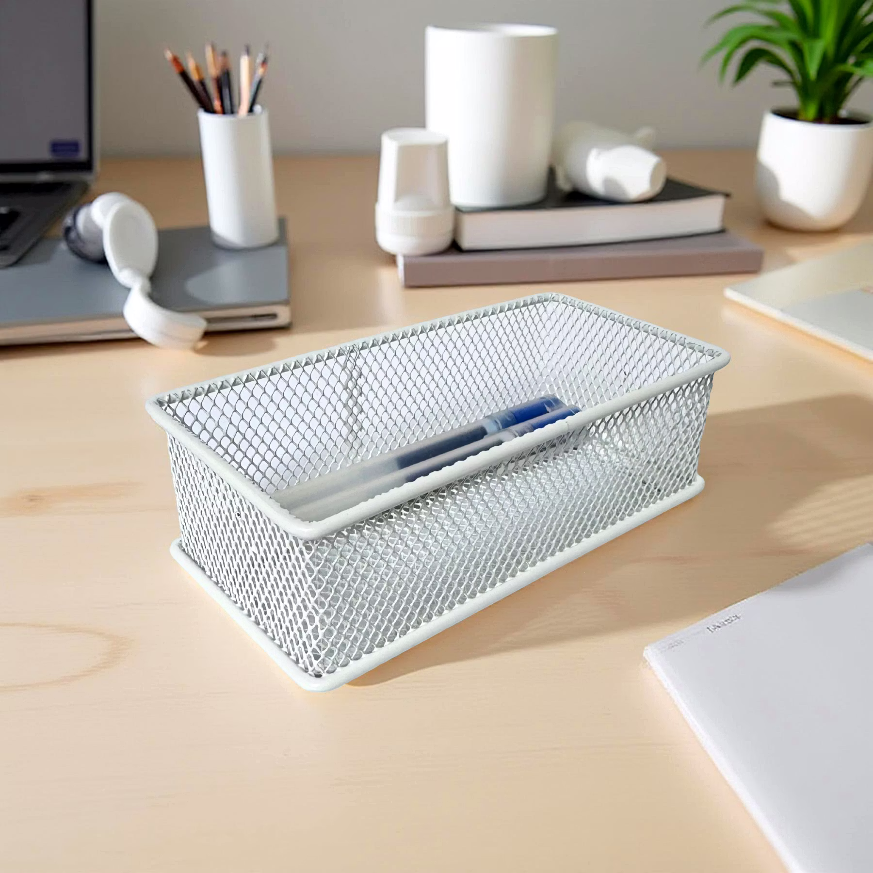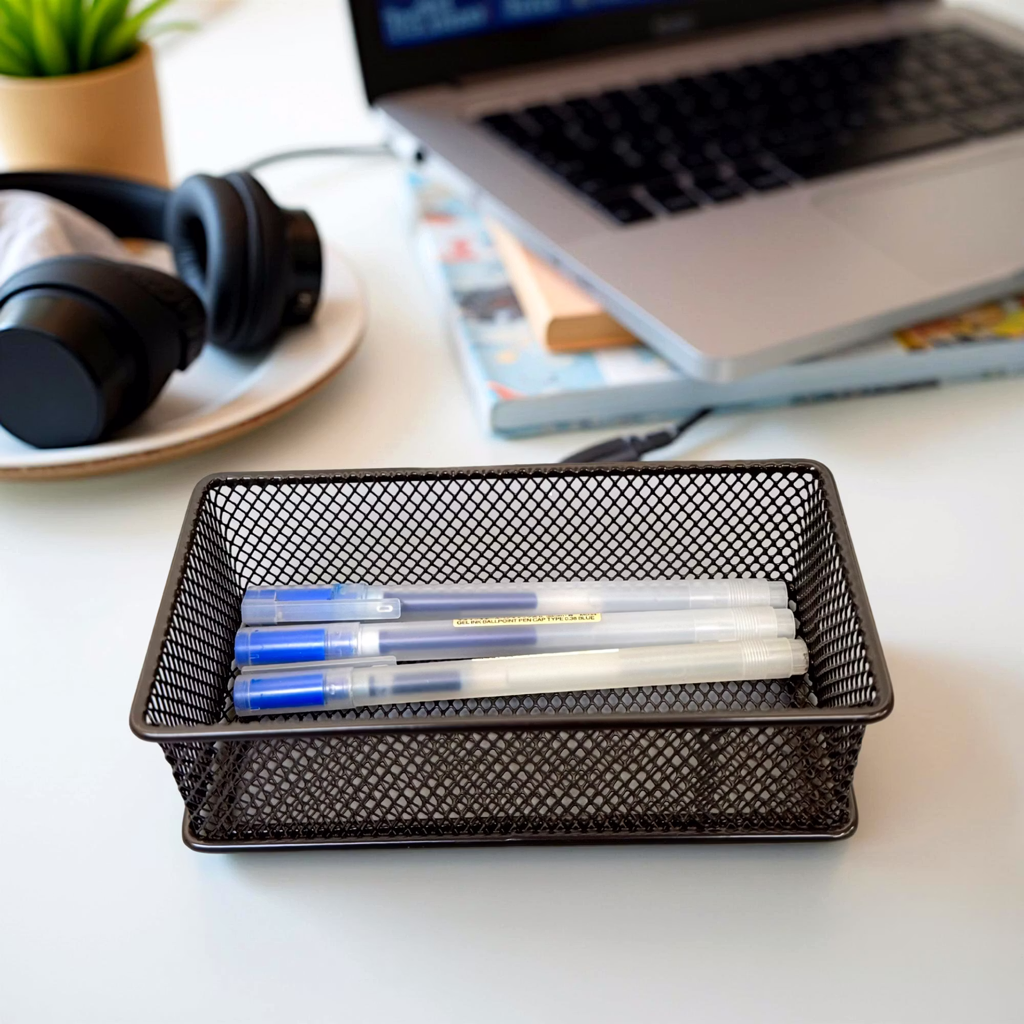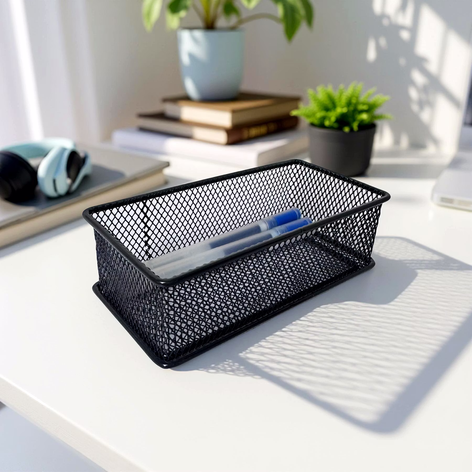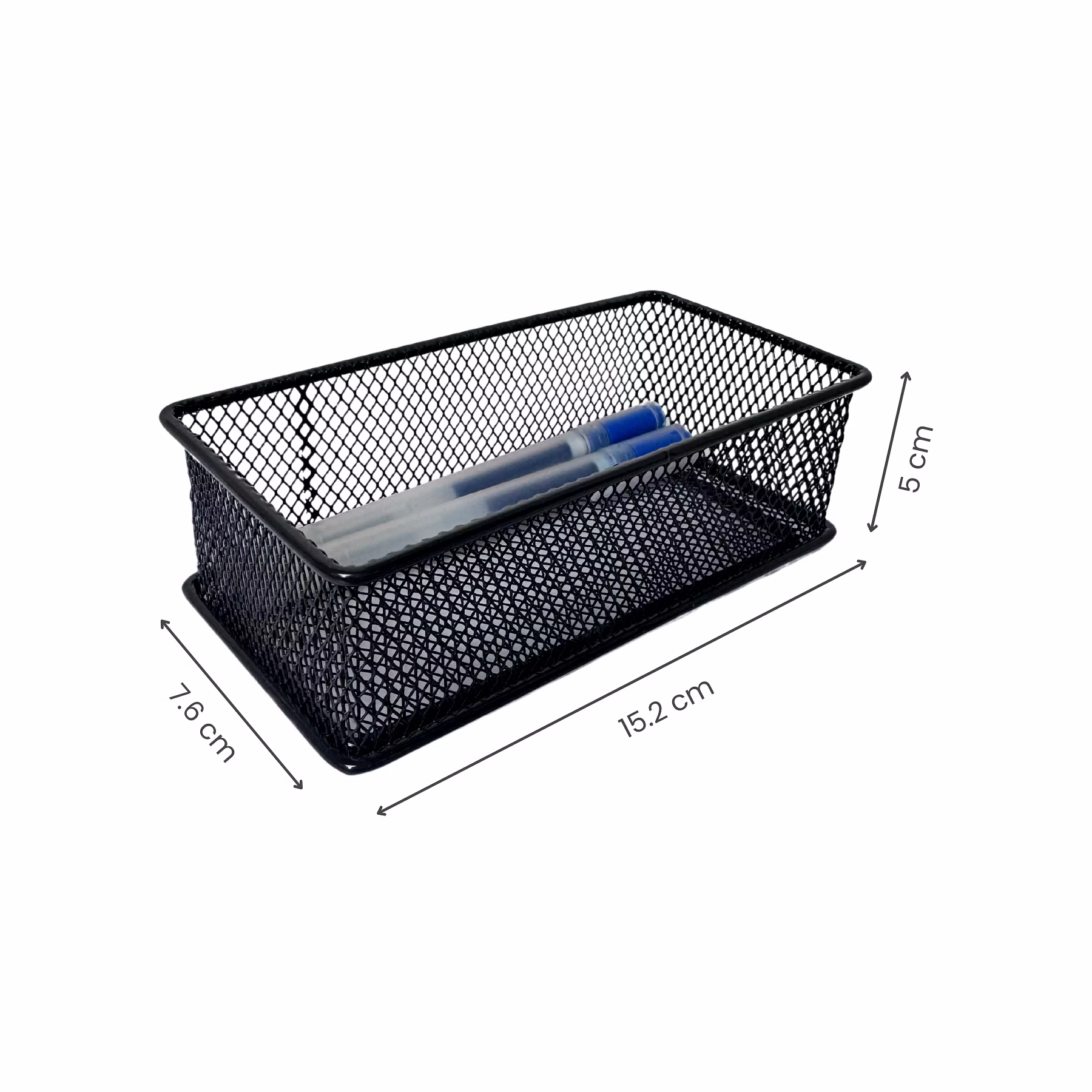 Keep your workspace neat and stylish with our Mesh Desk Organizer Tray. Crafted from durable metal with a sleek black finish, this open-top organizer is perfect for storing pens, markers, and small office supplies. Its modern design fits effortlessly into any home or office setting, providing easy access while maintaining a clean, professional look.