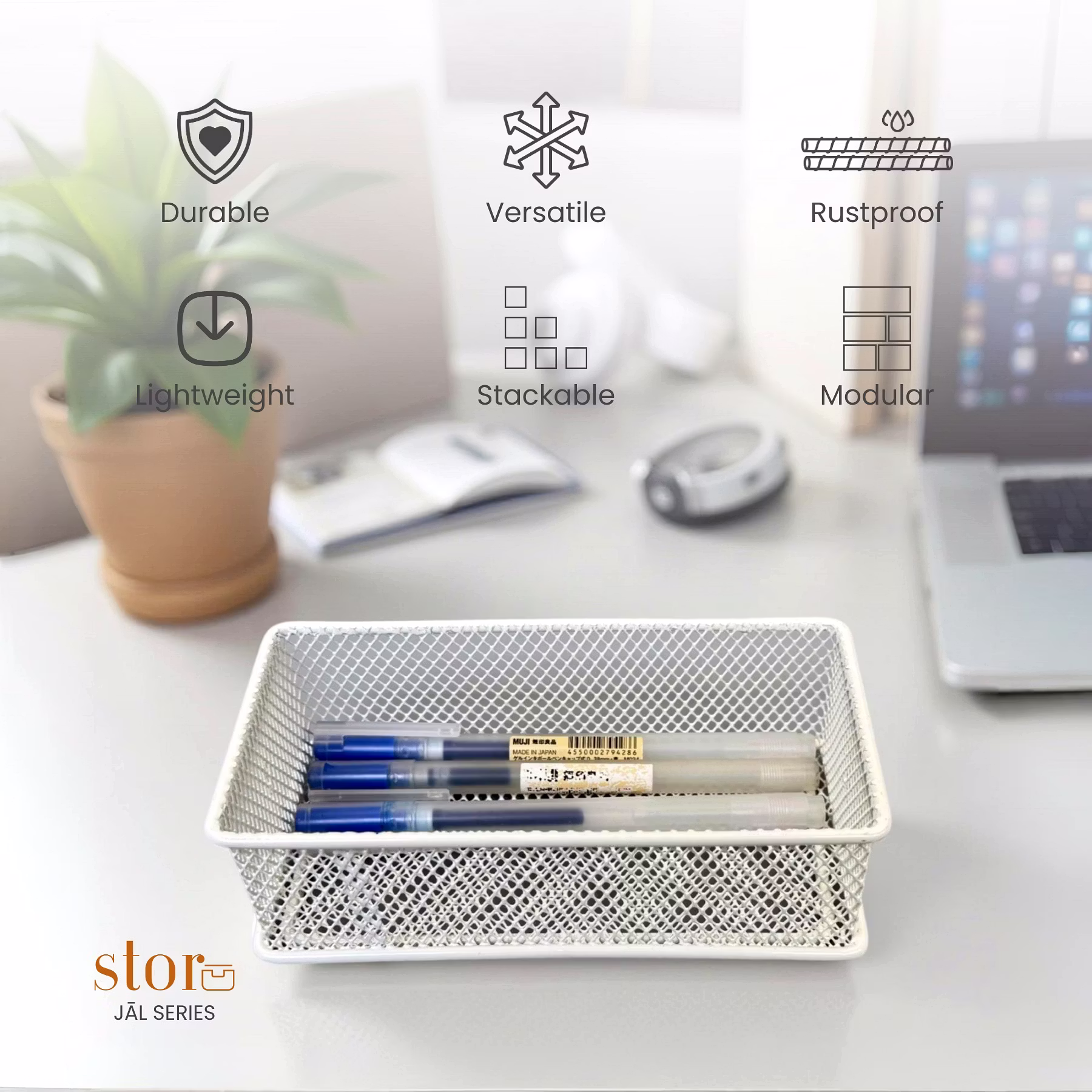 Maximise storage with our Stackable Mesh Storage Organiser, crafted from durable, powder-coated metal for a sleek and sturdy design. Its stackable structure helps optimize space, making it perfect for organizing office supplies, toiletries, kitchen essentials, and more. The open-mesh design ensures visibility and easy access, keeping your space tidy and efficient!