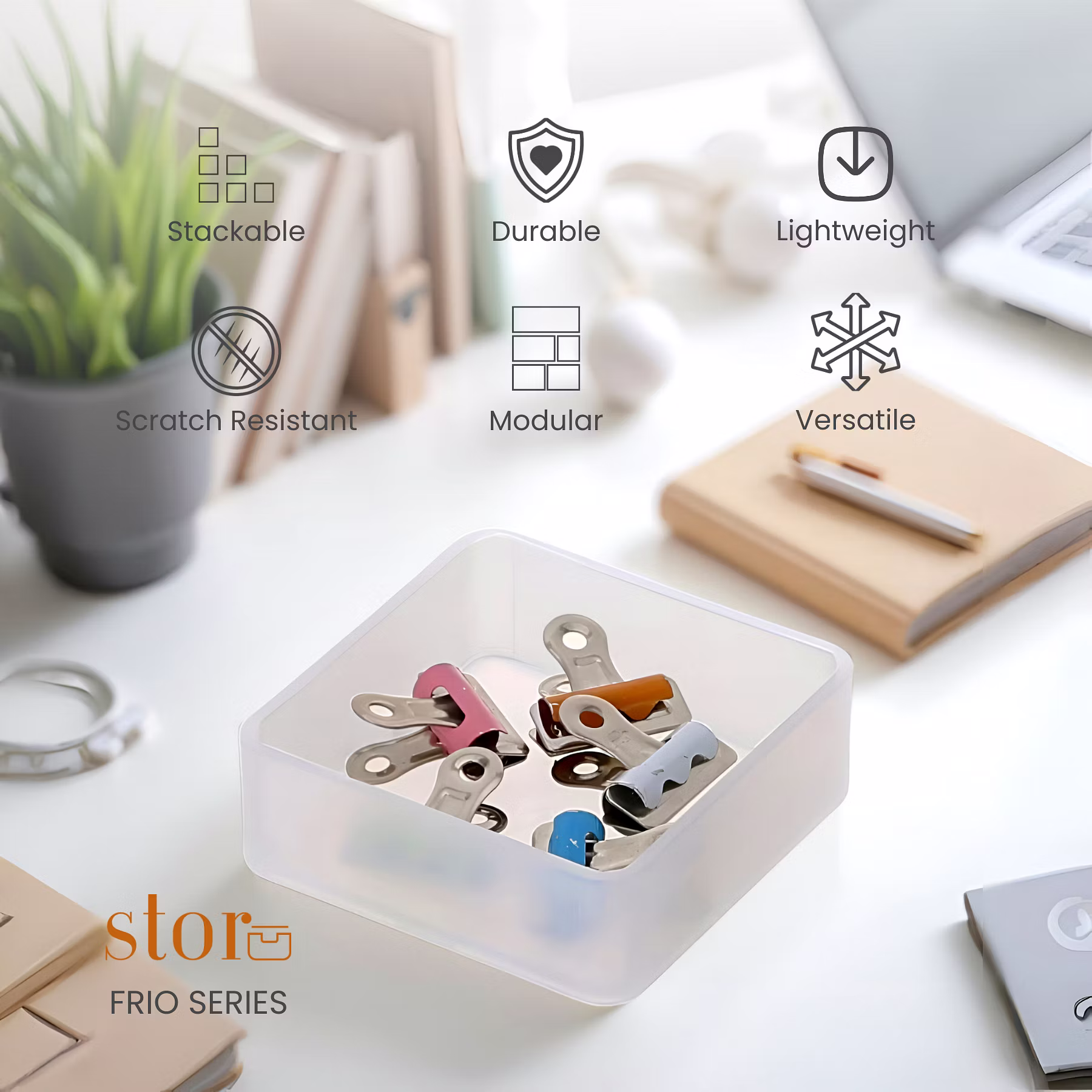 Declutter with ease using our Stackable Storage Organiser, crafted from durable, frosted white polypropylene for a sleek, modern look. Its modular, stackable design maximizes vertical space, making it perfect for closets, kitchens, offices, and bathrooms. Ideal for storing pantry items, toiletries, stationery, and more?keep everything organised and within reach!