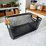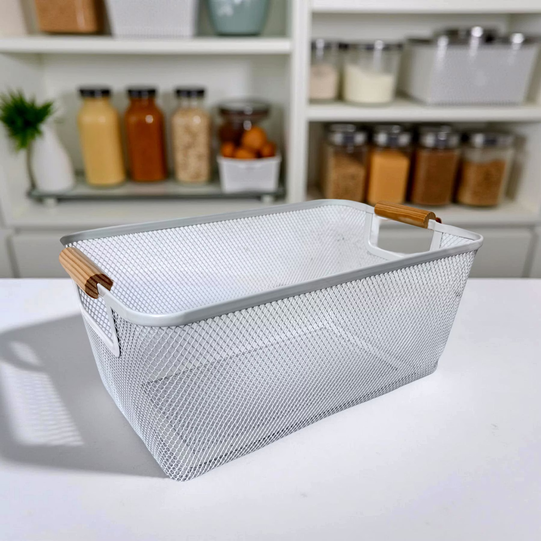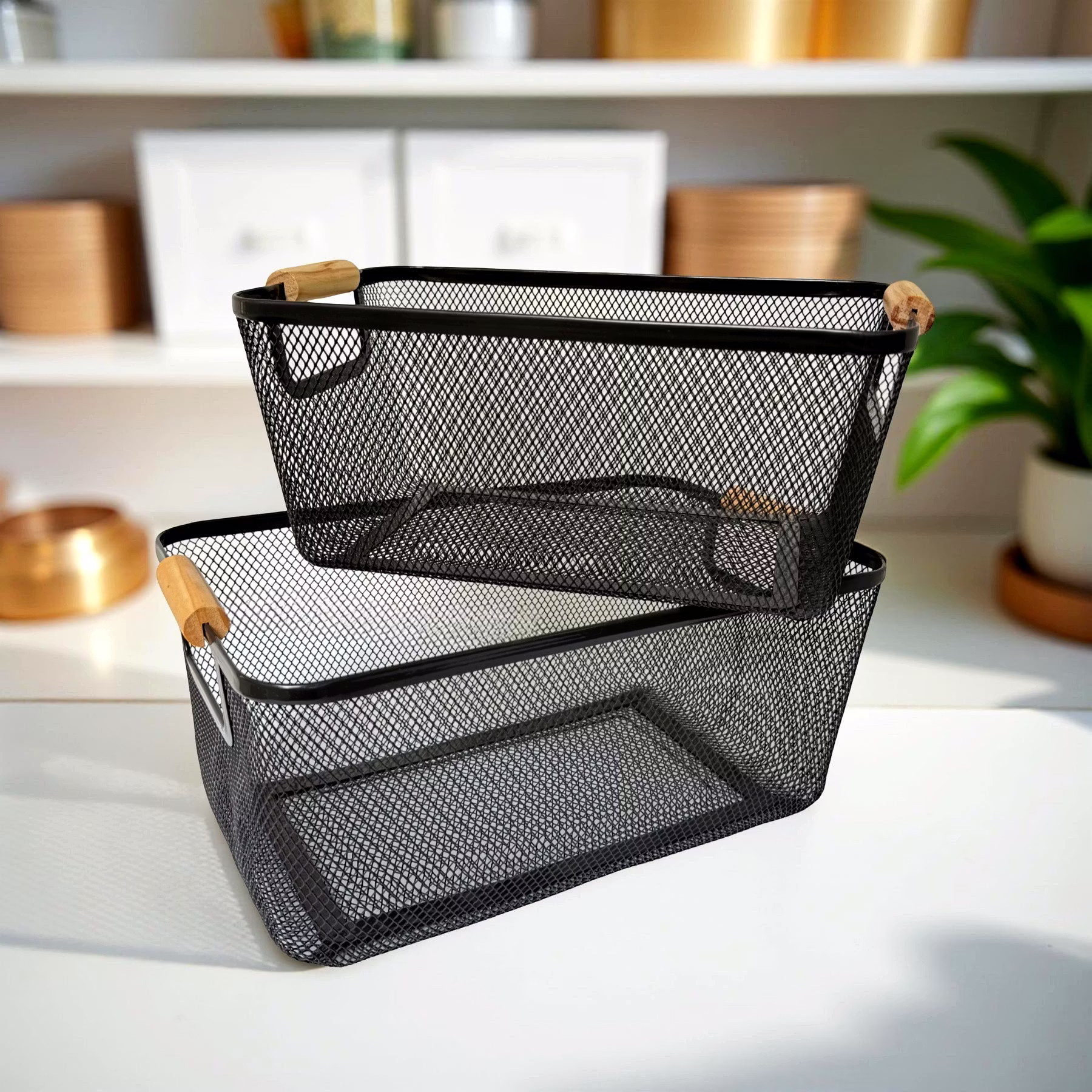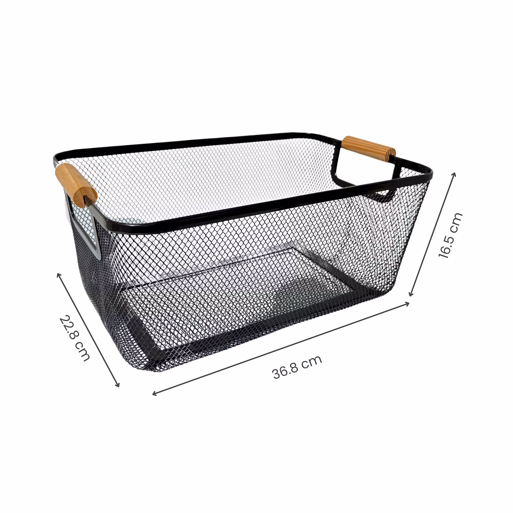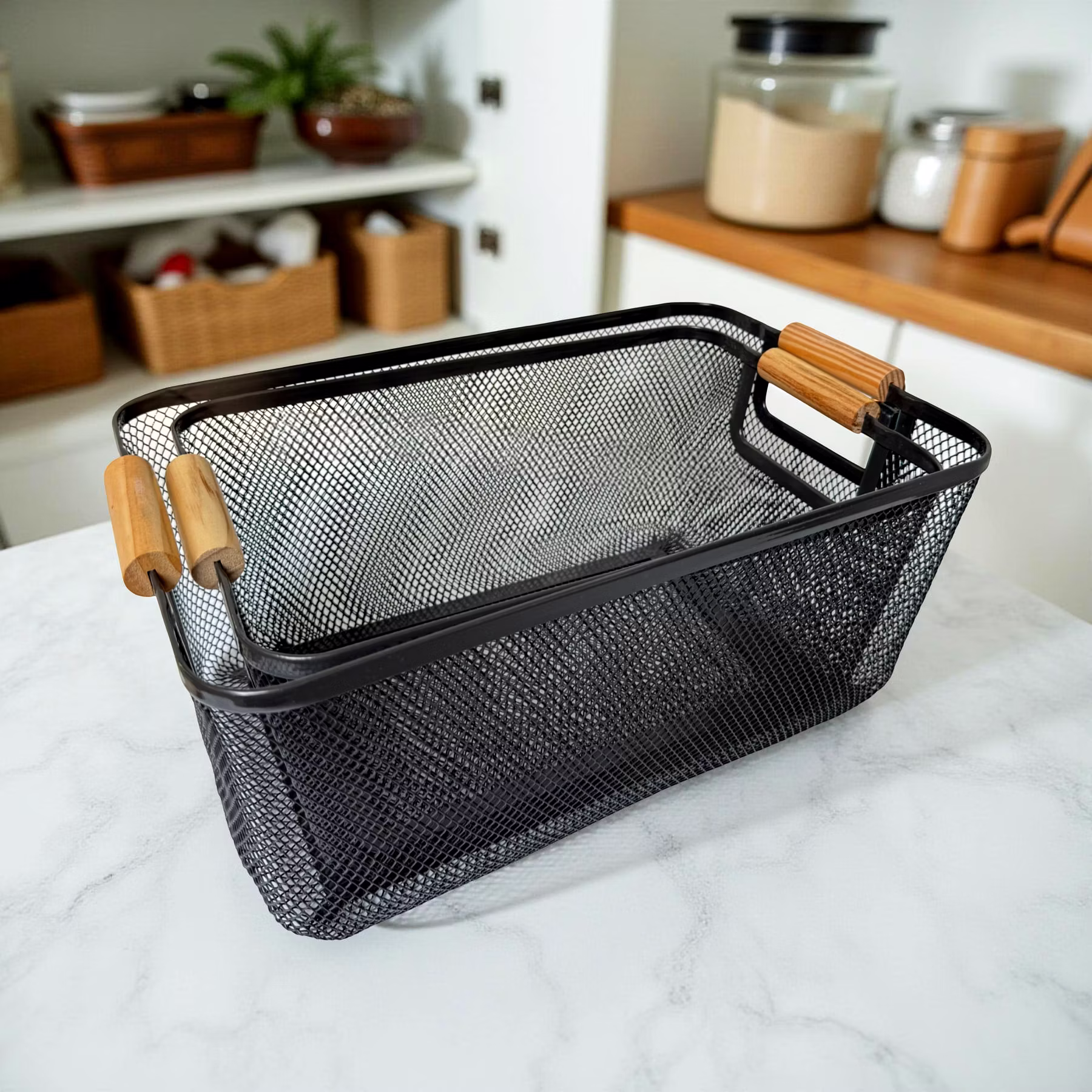 Elevate your storage game with the Rectangular Metal Mesh Storage Basket. Designed with a sturdy black mesh body and smooth wooden handles for effortless portability, this versatile basket is perfect for organizing pantry goods, office supplies, laundry items, and more. Its breathable mesh construction allows for easy visibility and airflow, blending seamlessly with modern, rustic, or industrial decor.