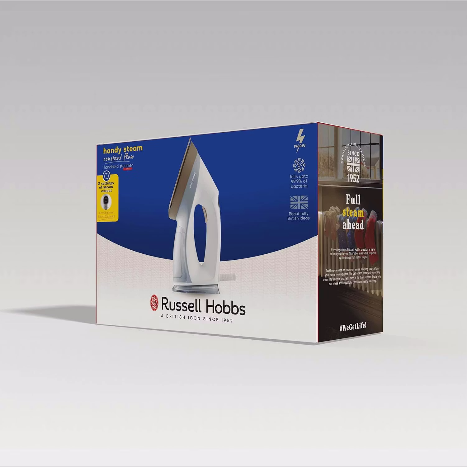 Russell Hobbs 1960W Handy Garment Steamer offers efficient vertical and horizontal steaming, fast heat-up, and hygienic wrinkle removal, all in a compact, easy-to-use design.