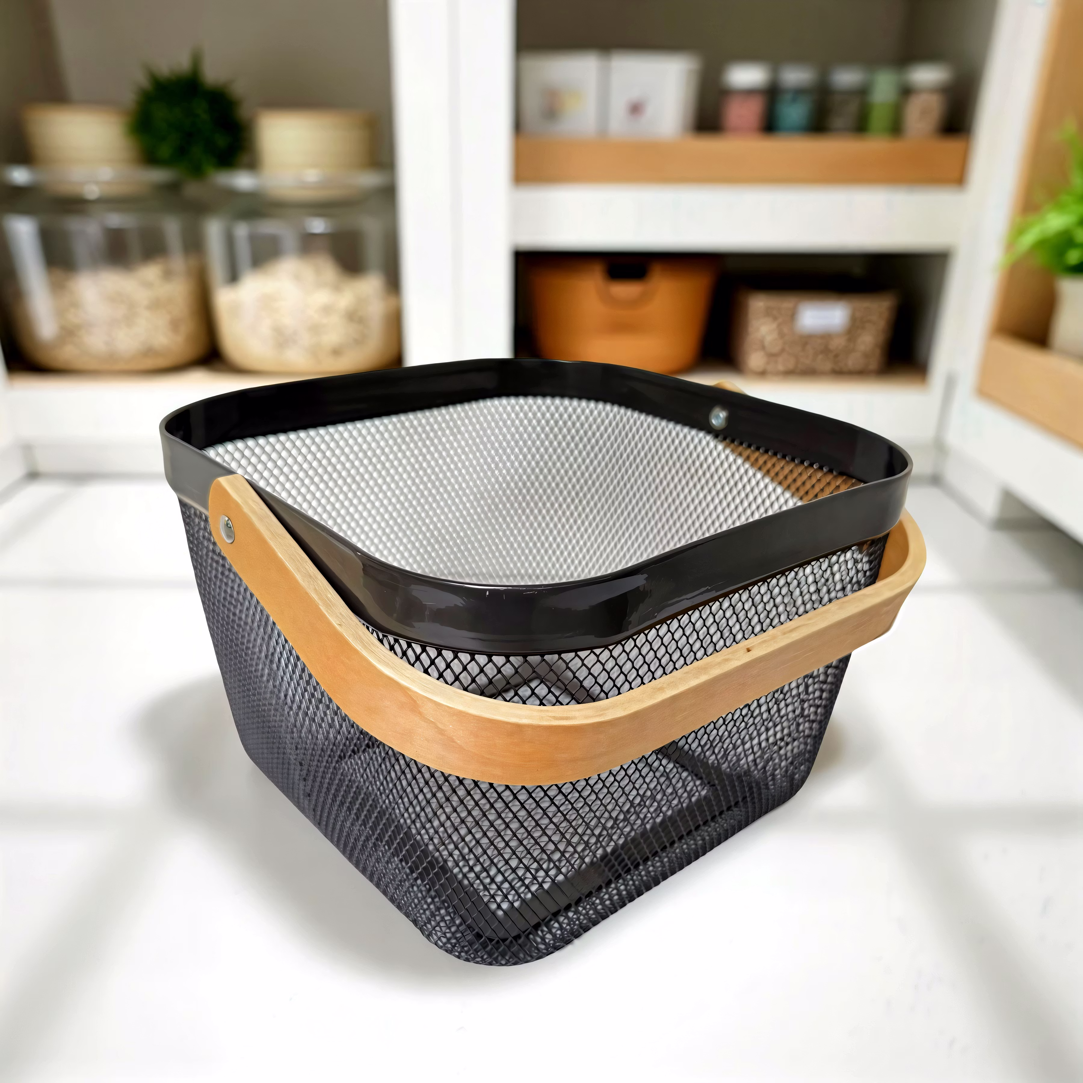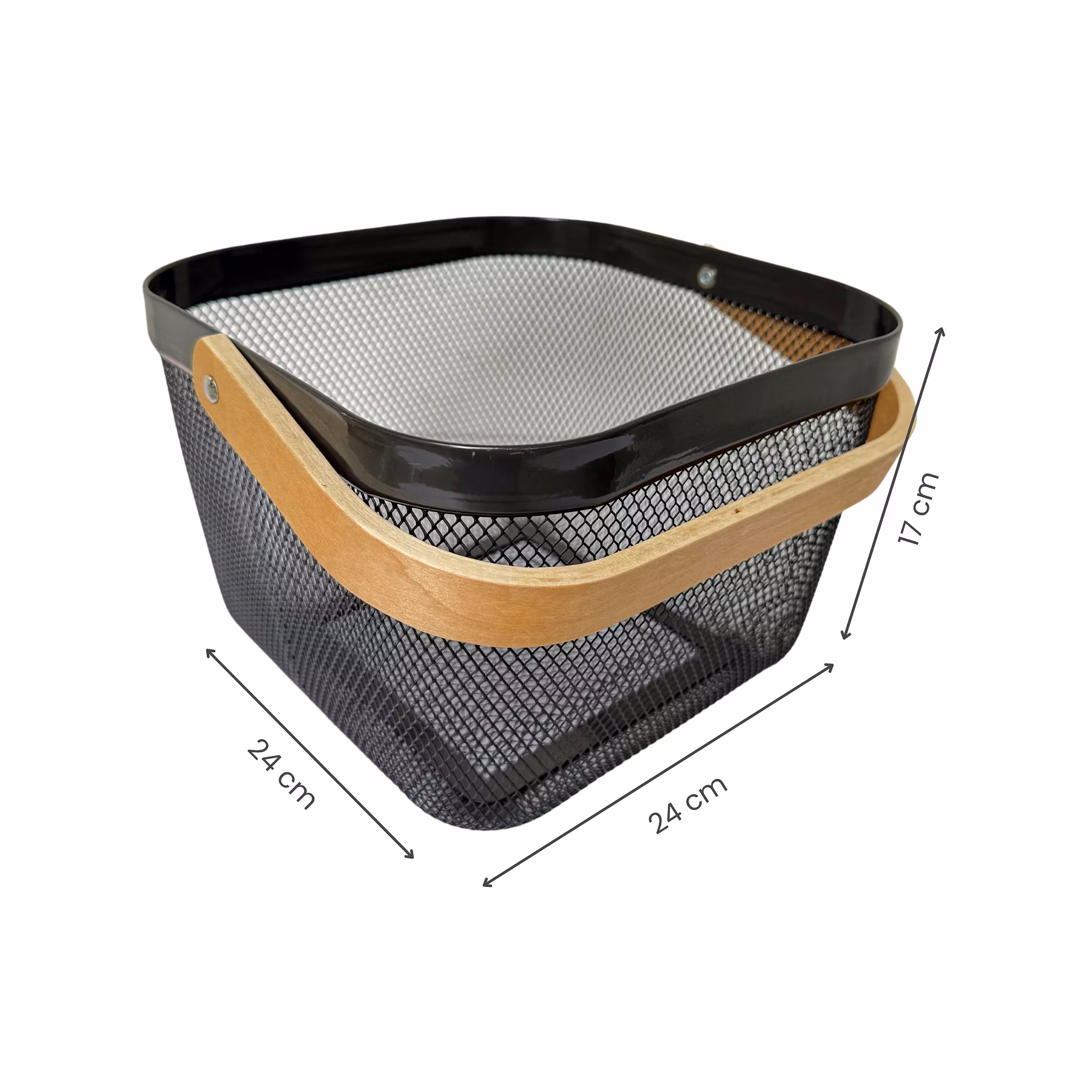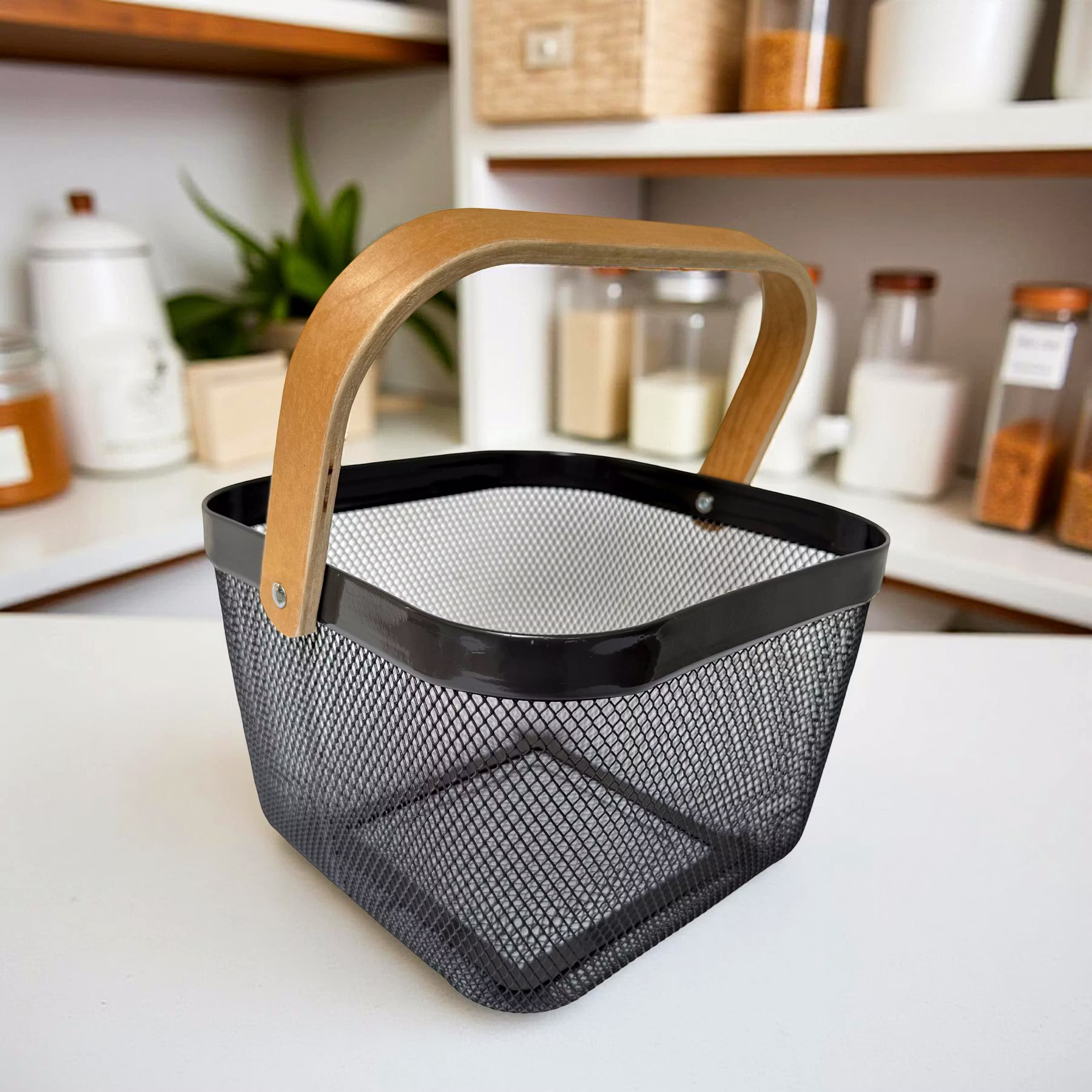 Add a stylish and functional touch to your storage solutions with the Square Metal Mesh Basket. Featuring a sturdy black metal mesh frame and two elegantly curved wooden handles, this basket blends modern design with natural warmth. Perfect for organizing pantry goods, toiletries, office supplies, or craft materials, it offers easy carrying and a sleek aesthetic that complements any room decor.