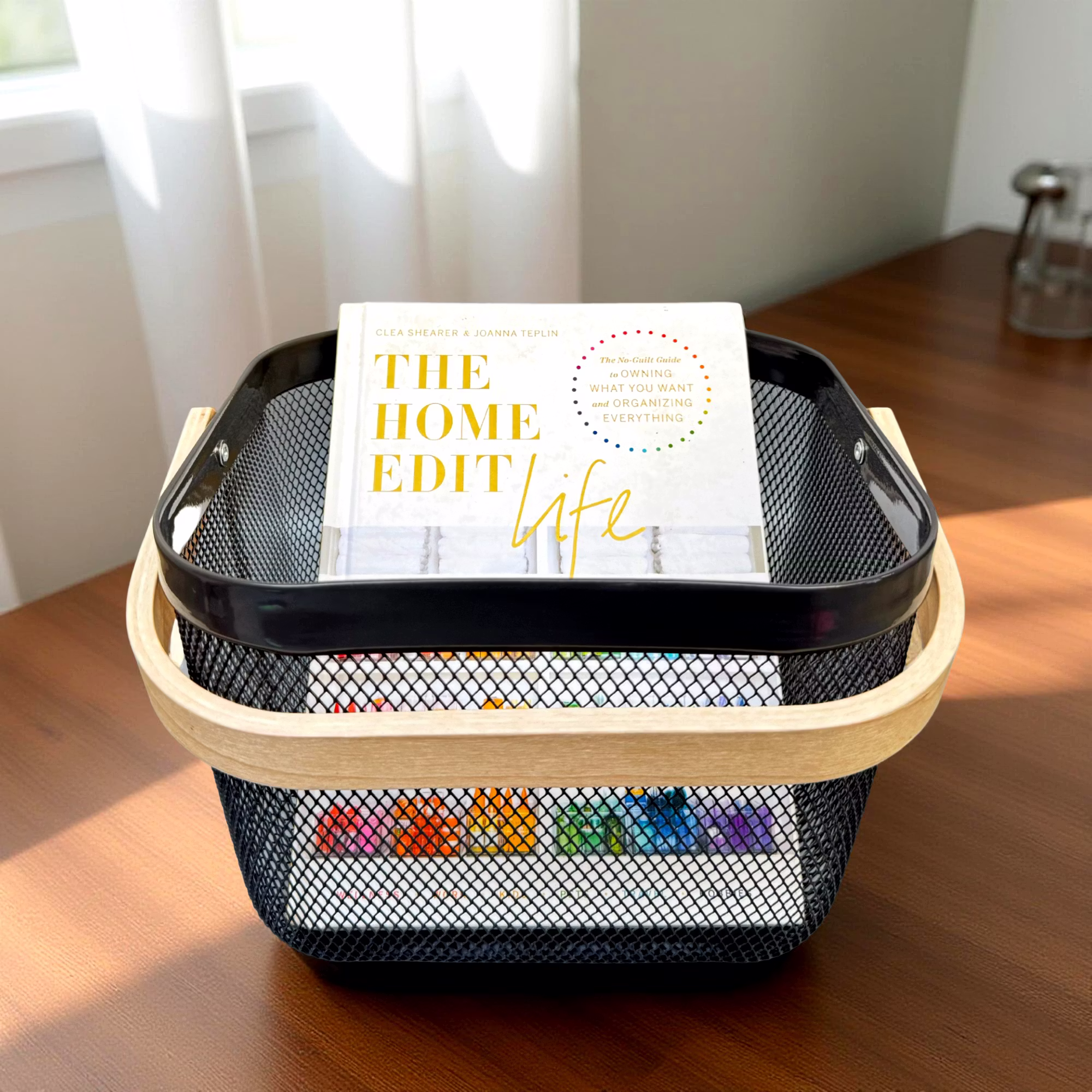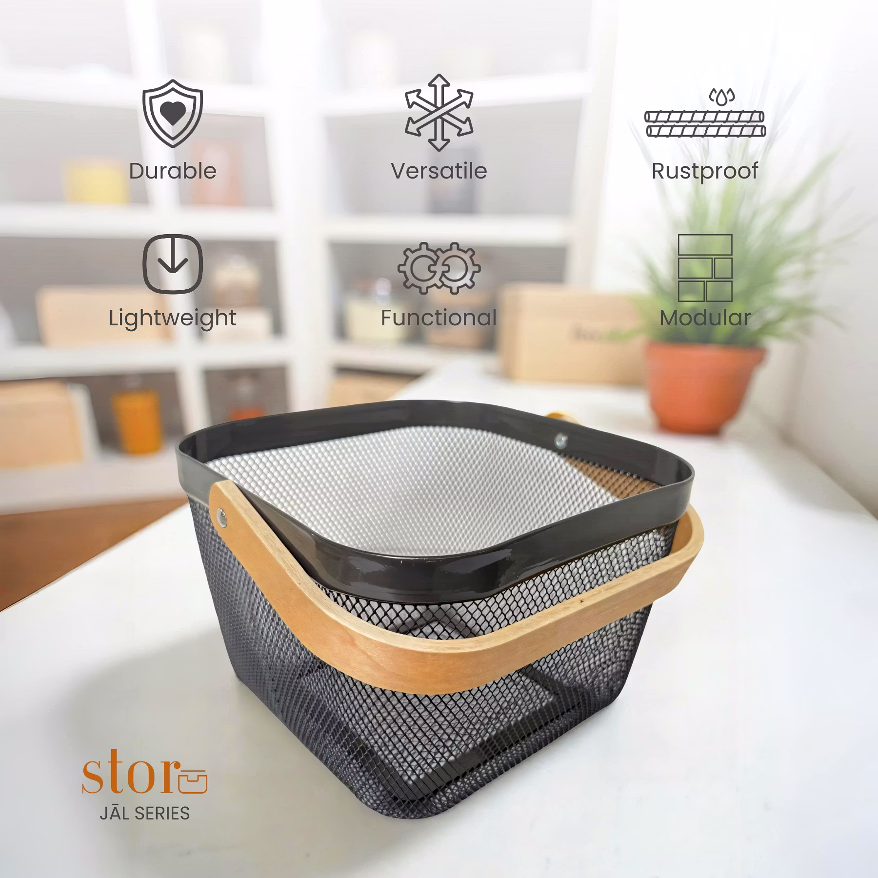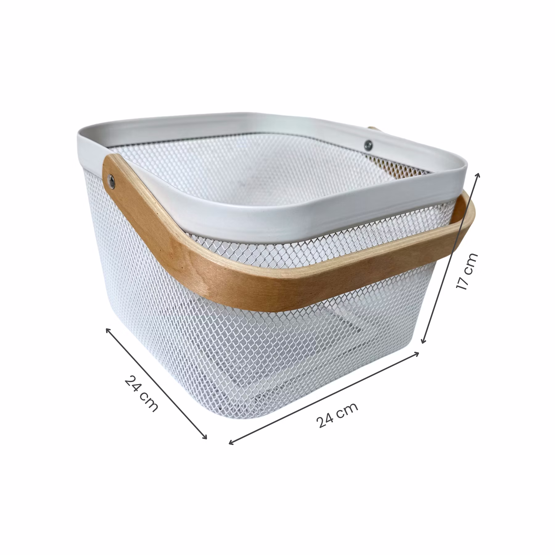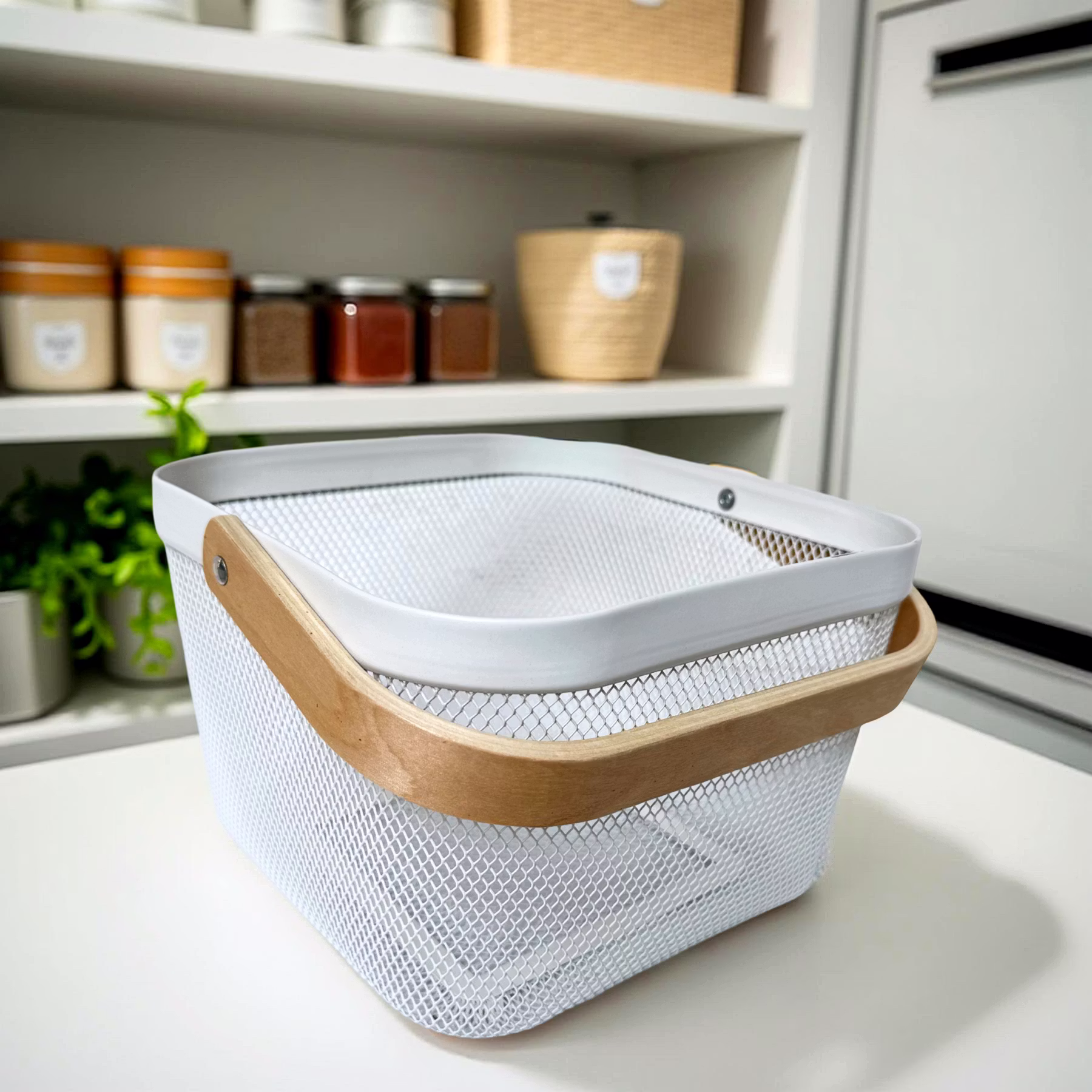 Add a stylish and functional touch to your storage solutions with the Square Metal Mesh Basket. Featuring a sturdy black metal mesh frame and two elegantly curved wooden handles, this basket blends modern design with natural warmth. Perfect for organizing pantry goods, toiletries, office supplies, or craft materials, it offers easy carrying and a sleek aesthetic that complements any room decor.