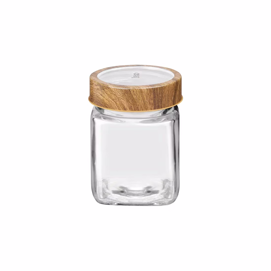 Buy Treo square glass jar with airtight wooden-finish lid. Ideal for storing spices, dry fruits, tea, sugar, and snacks in style.