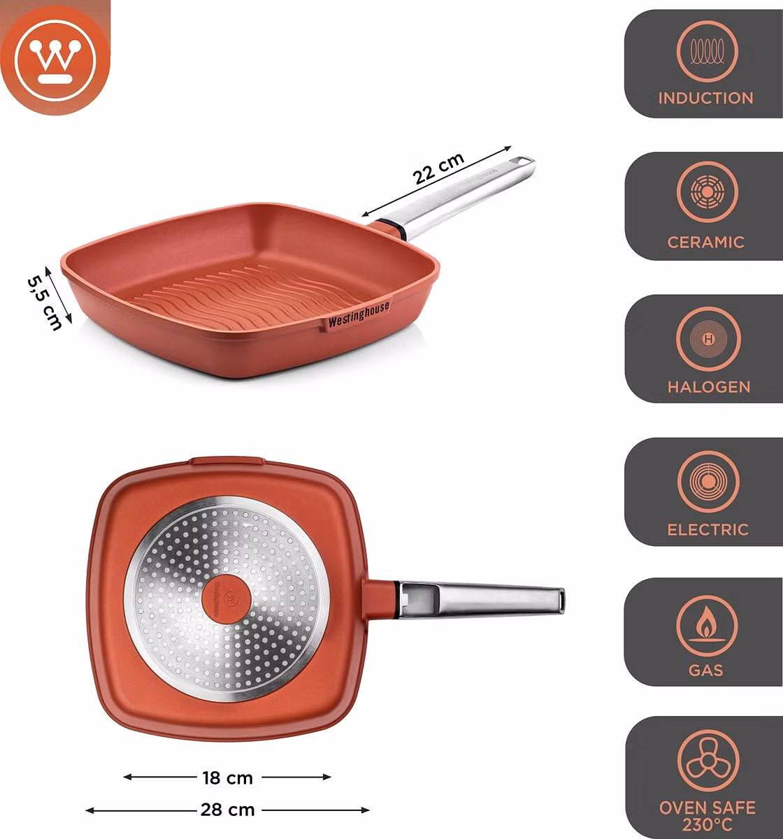 Shop Westinghouse 28cm Grill Pan in stylish terracotta color. Features non-stick coating, ribbed surface, and stainless steel handle. Ideal for grilling meats & veggies!